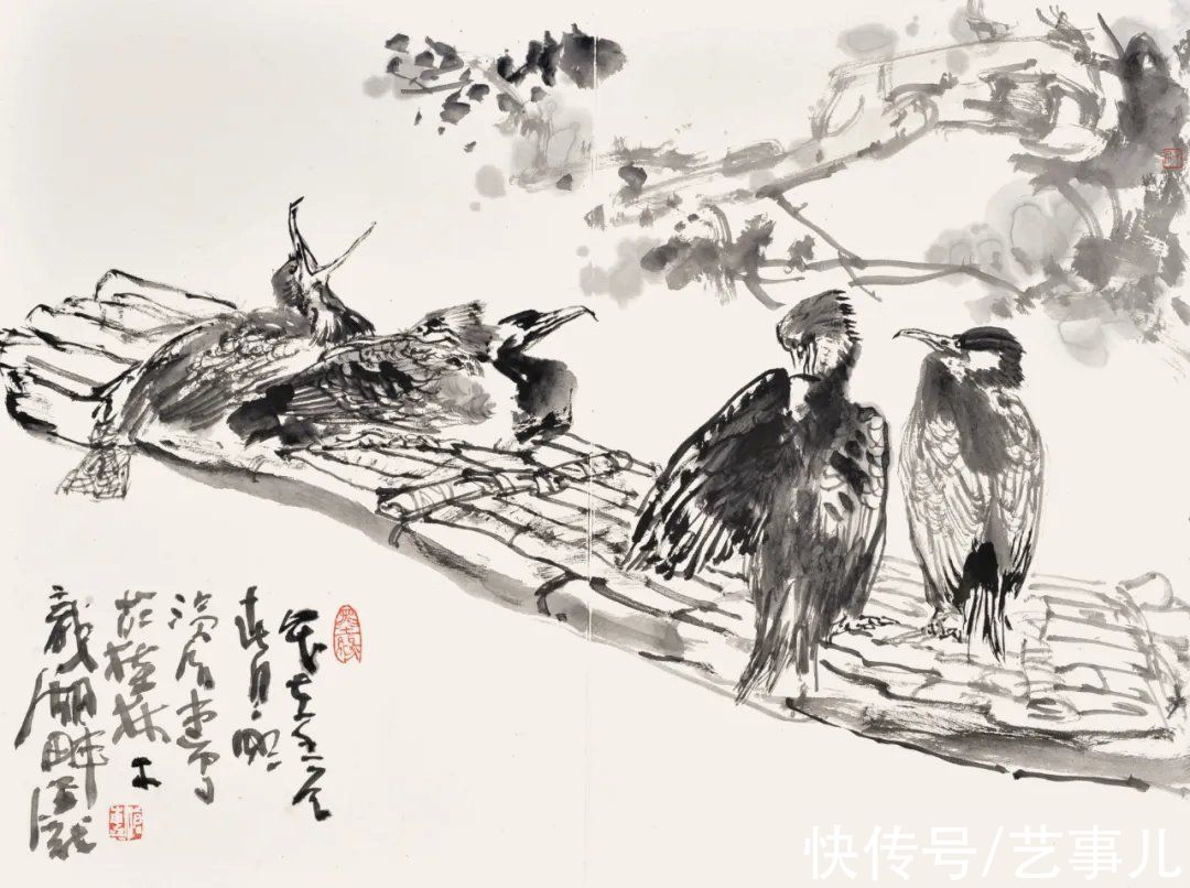 在遇龙湖上画了几幅写生,在湖畔的书童山庄午歺,于是就画了附近的小河旁竹筏上的鸬鹚;写生了山庄旁拔地而起山包;河边的竹林;那一日,和乡弟孙阳在微雨中游木龙湖,登叠彩山,写生仙鹤洞,登上山顶时,雨大了起来,于是便在亭中小憩,雨中远眺,似乎发现乡贤可染先生笔下桂林山水的出处了,孙阳弟执伞,我便在雨中对景写生,雨水打在纸面的墨迹上,形成了自然的水晕,约五分钟,匆匆画成,这便是“雨中叠彩山”的由来了。